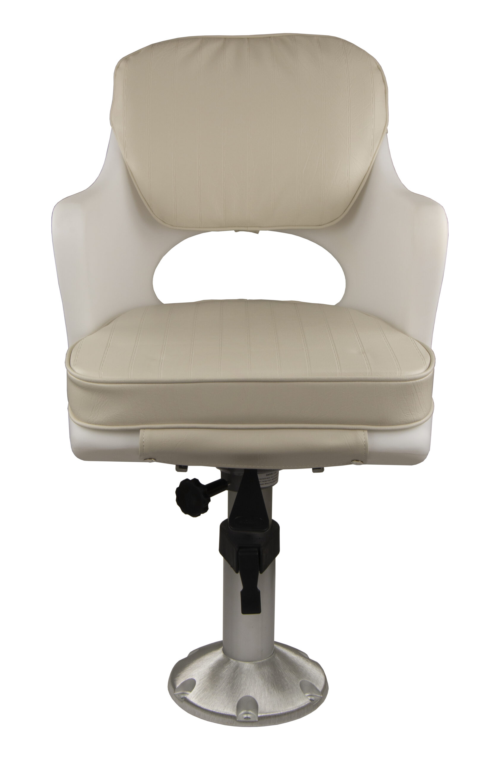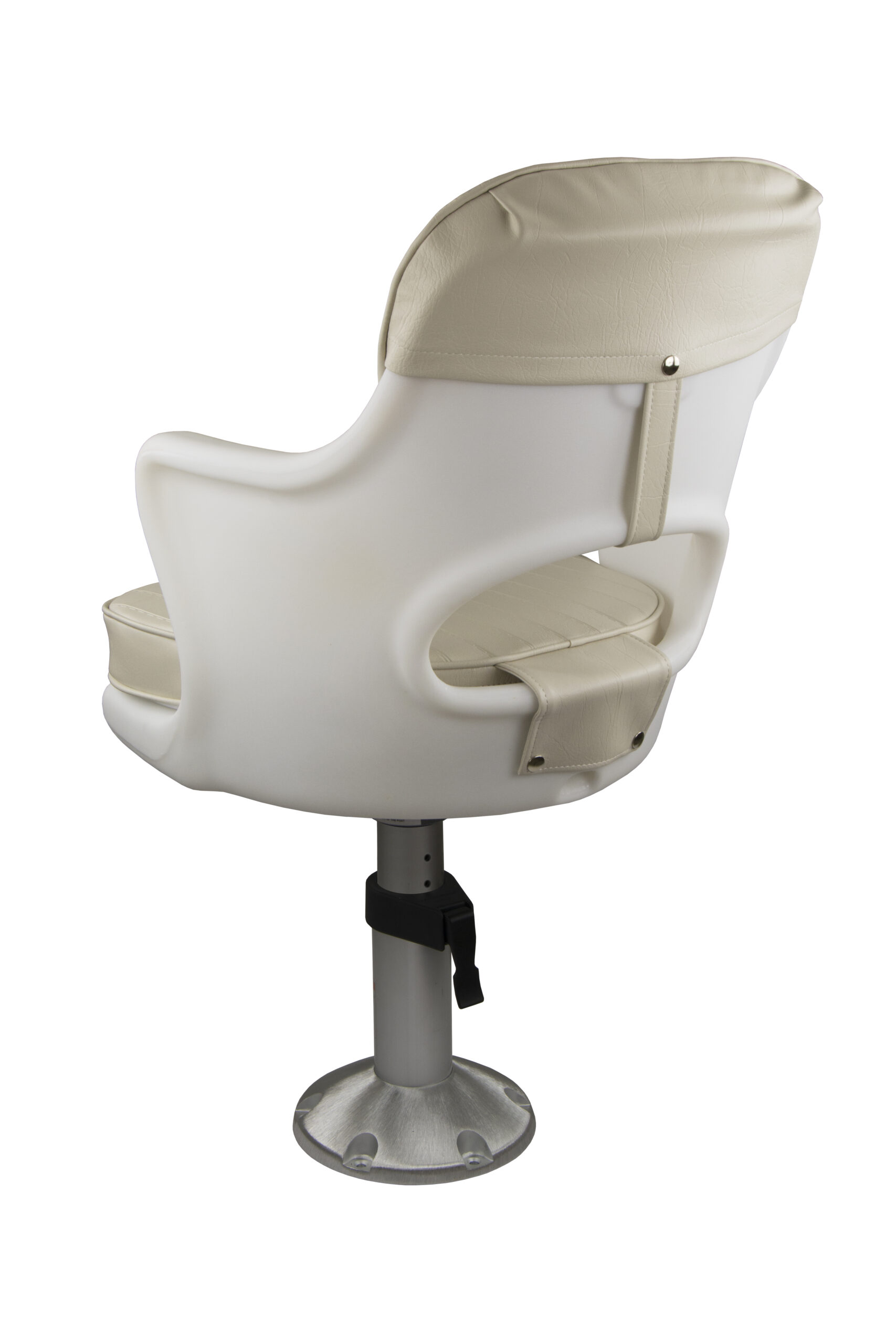 The Commodore package includes Commodore molded seat with off white cushions and adjustable 2-3/8″ locking Trac-Lock™ swivel that rotates 360°. The Trac-Lock™ pedestal is manually adjustable from 13″ to 16″, with a 9″ floor base, and satin finish.