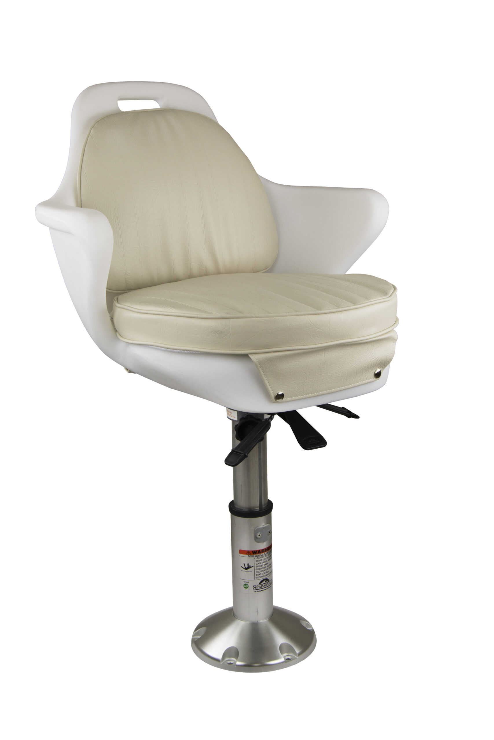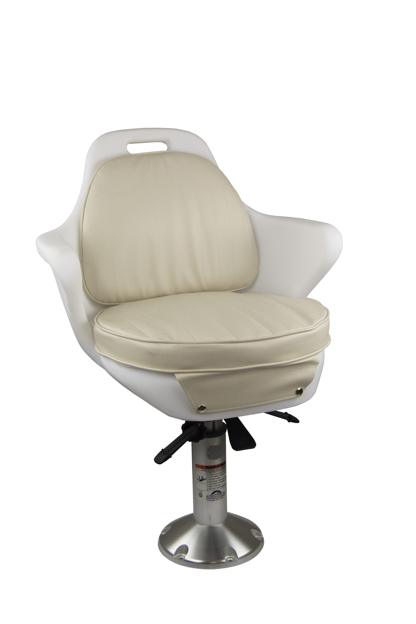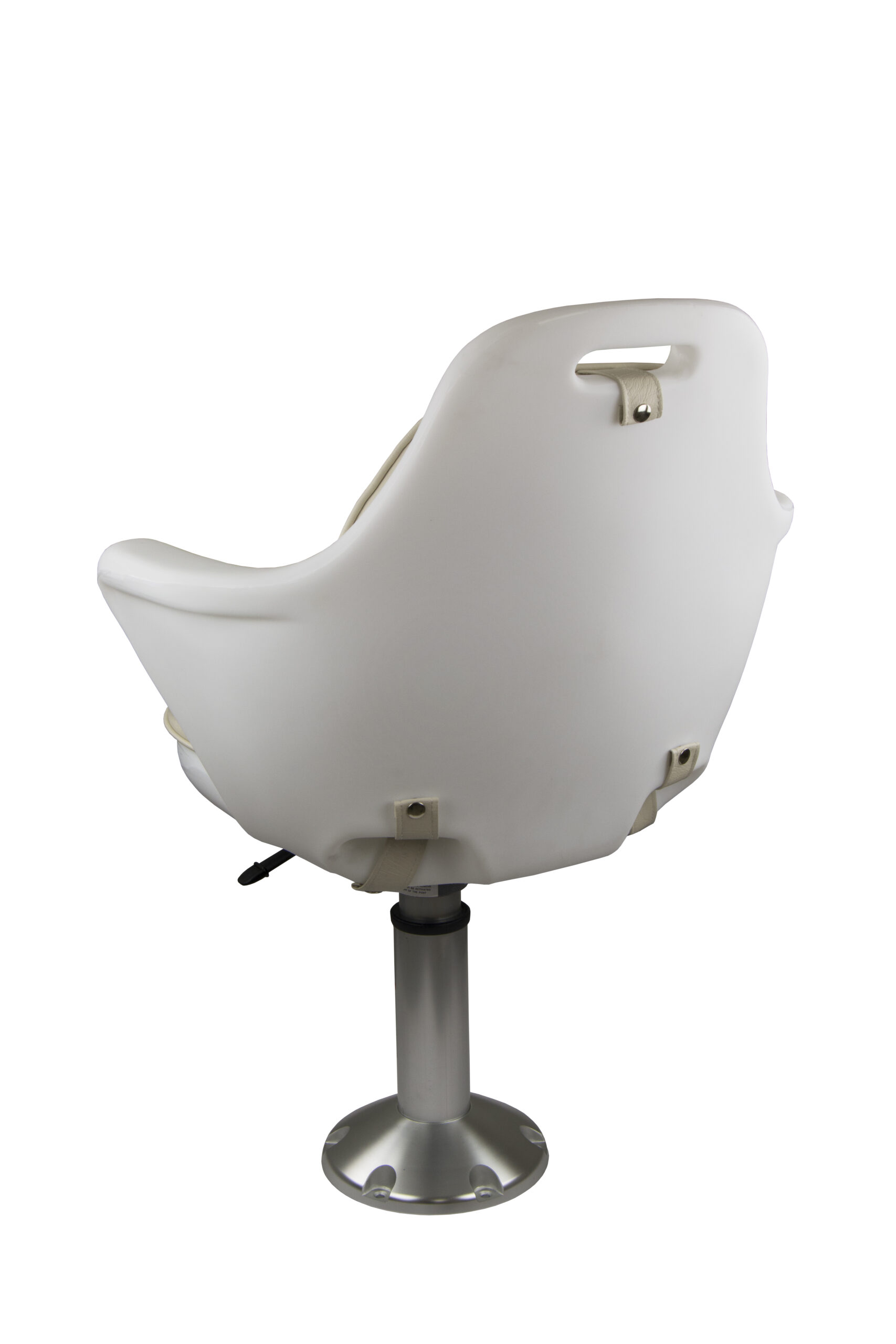 Package includes Bluewater extra-wide molded seat with off white cushions, 2-3/8″ locking Trac-Lock™ air-ride slide & swivel, rotates 360°, and an air-powered adjustable mainstay with 9″ round base, anodized finish. The slide travels 5-1/4″ fore and aft. Cushions are made with plush foam padding covered in marine-grade vinyl and snap easily onto seat.