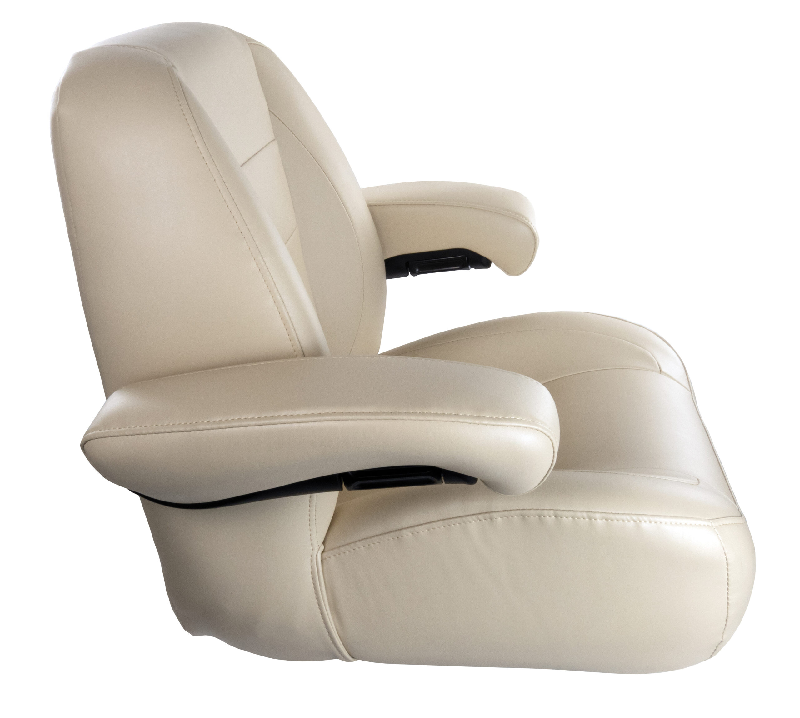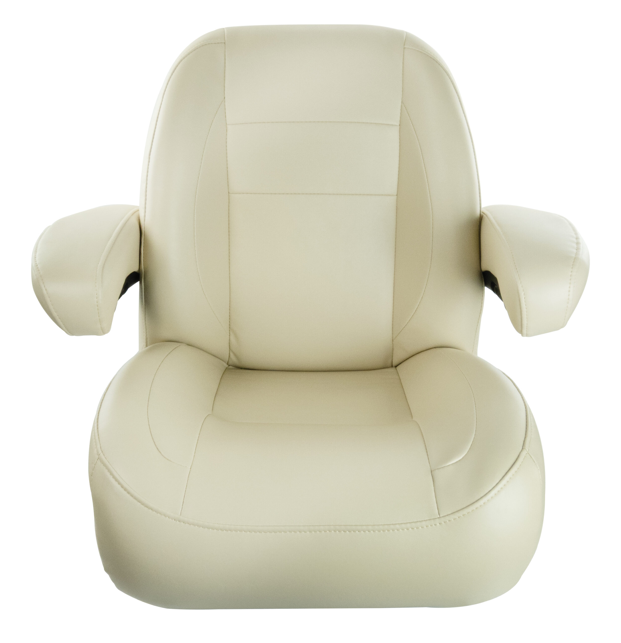 Luxury pontoon helm seat features a heavy-duty powder-coated steel frame, providing maximum comfort and support for the harshest of conditions. Plush foam padding covered in premium heavy-duty marine-grade vinyl for ultimate protection against mold, mildew, and harmful UV rays. Long days on the water just got more enjoyable thanks to the suspension springs that guarantee a smoother ride. Armrests flip up and out of the way to suit your comfort needs. This seat is finished in a neutral cream color to seamlessly match a variety of color schemes. Universal 5″ x 12″ mounting pattern.