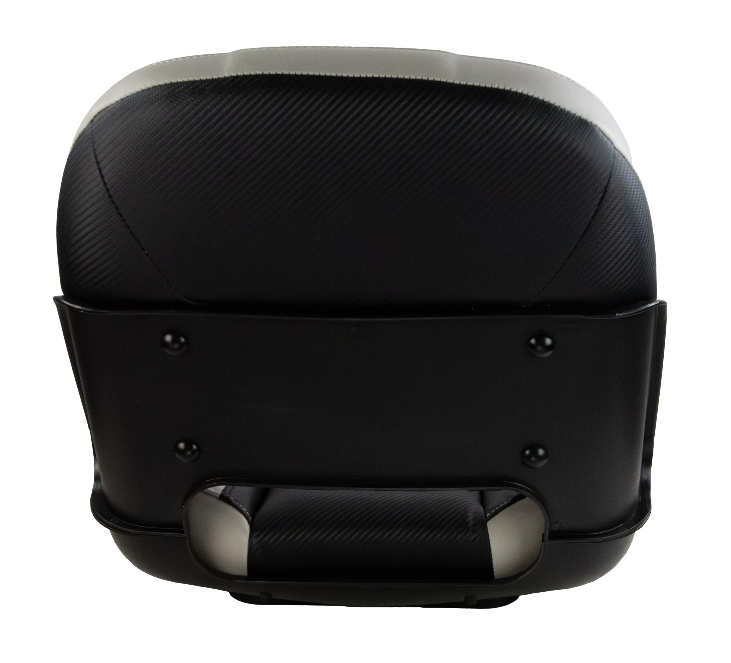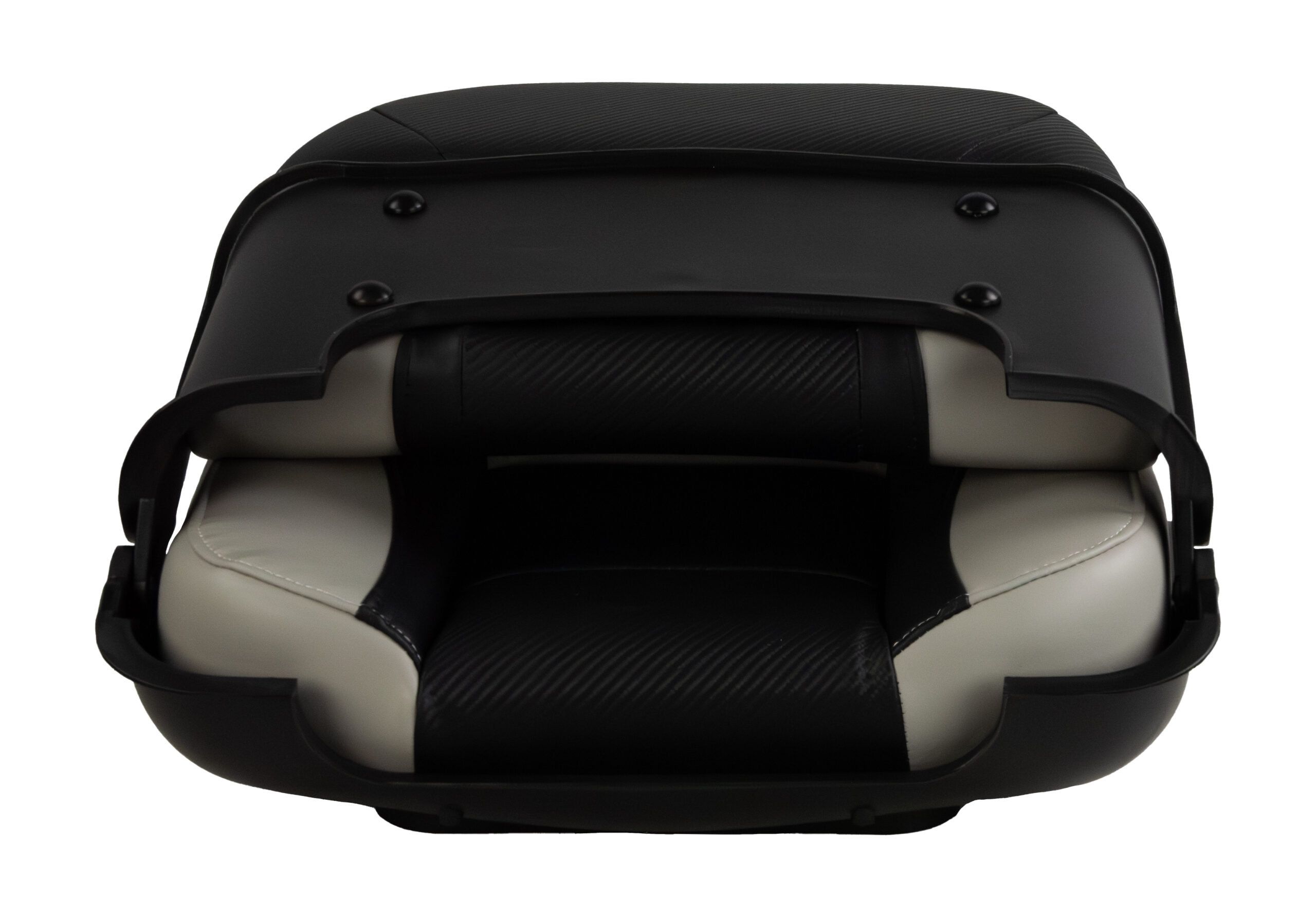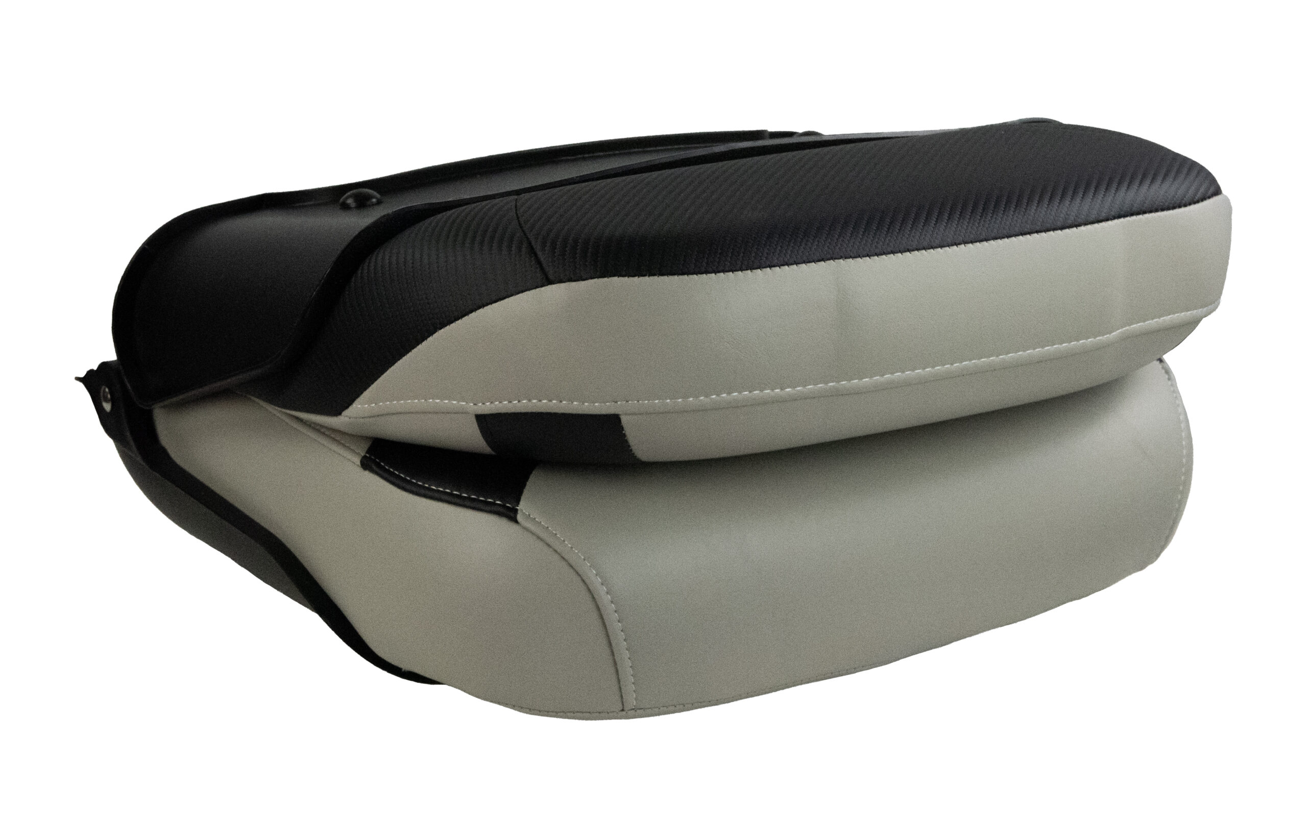 Extra wide injection molded seat with interlocking hinge for greater structural support. Folds down easily. Black shell with snap on gray-black cushions with high-quality marine-grade Grandeur and Imperial vinyl for all day comfort. T-Nuts installed into seat for better mounting durability. Universal mounting pattern: 5″ x 5″.