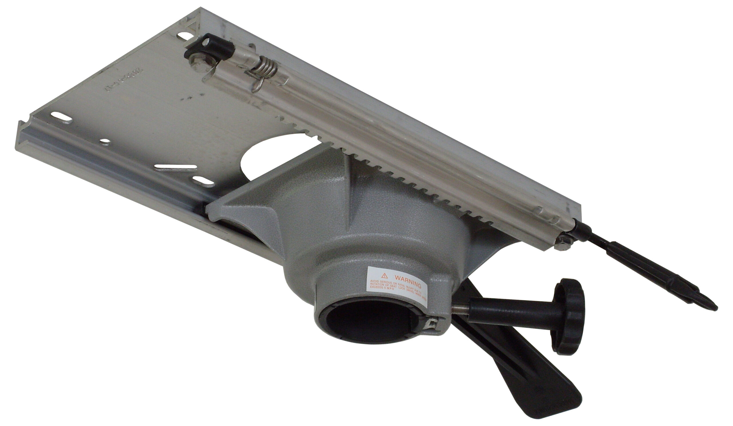 Large 7-1/4″ x 13″ high-strength anodized aluminum platform travels 5-1/4″ fore and aft on self-lubricating pads. Rotates 360°. Centrally located locking handle that is easily reachable with left or right hand. Adds 1-1/4″ of height to pedestal.