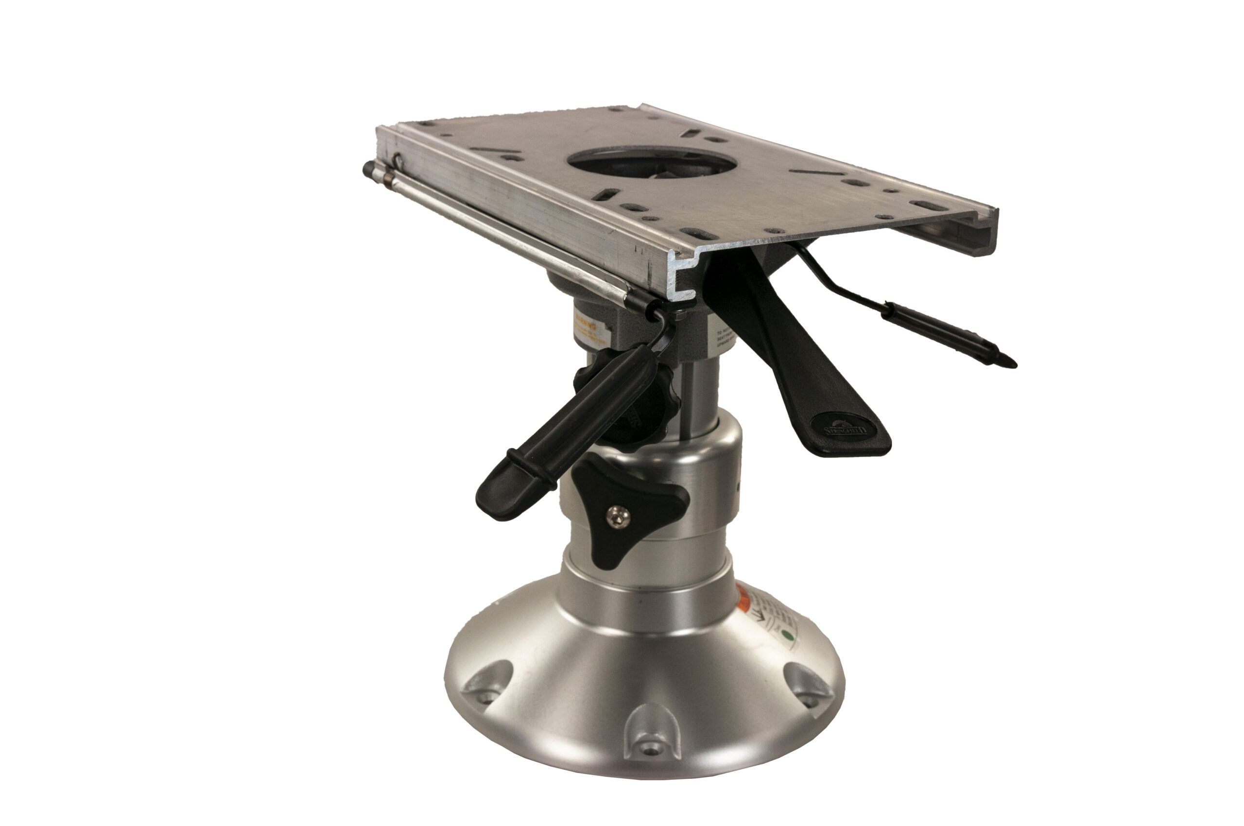 Package includes 2-7/8″ high-strength rigid 4-keyed anodized aluminum air-powered height adjustment pedestal (500 newton cylinder) with 9″ round anodized base, and locking Trac-Lock™ swivel & slide. 3-1/2″ outer post with 2-7/8″ inner post.