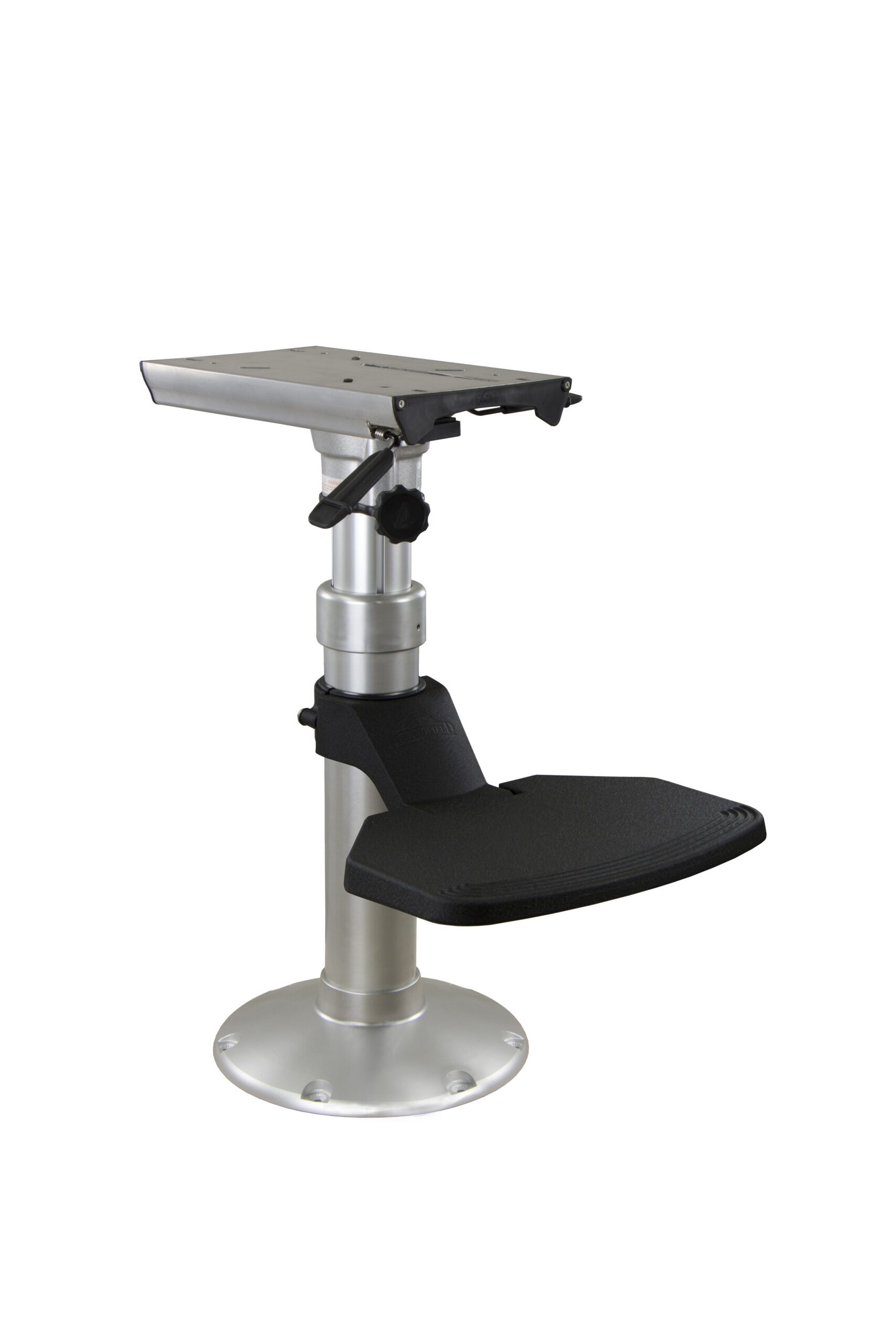 Package includes 2-7/8″ high-strength rigid 4-keyed anodized aluminum air-powered height adjustment pedestal with 12″ round anodized base, locking Trac-Lock™ swivel & slide, and footrest. 3-1/2″ outer post with 2-7/8″ inner post.