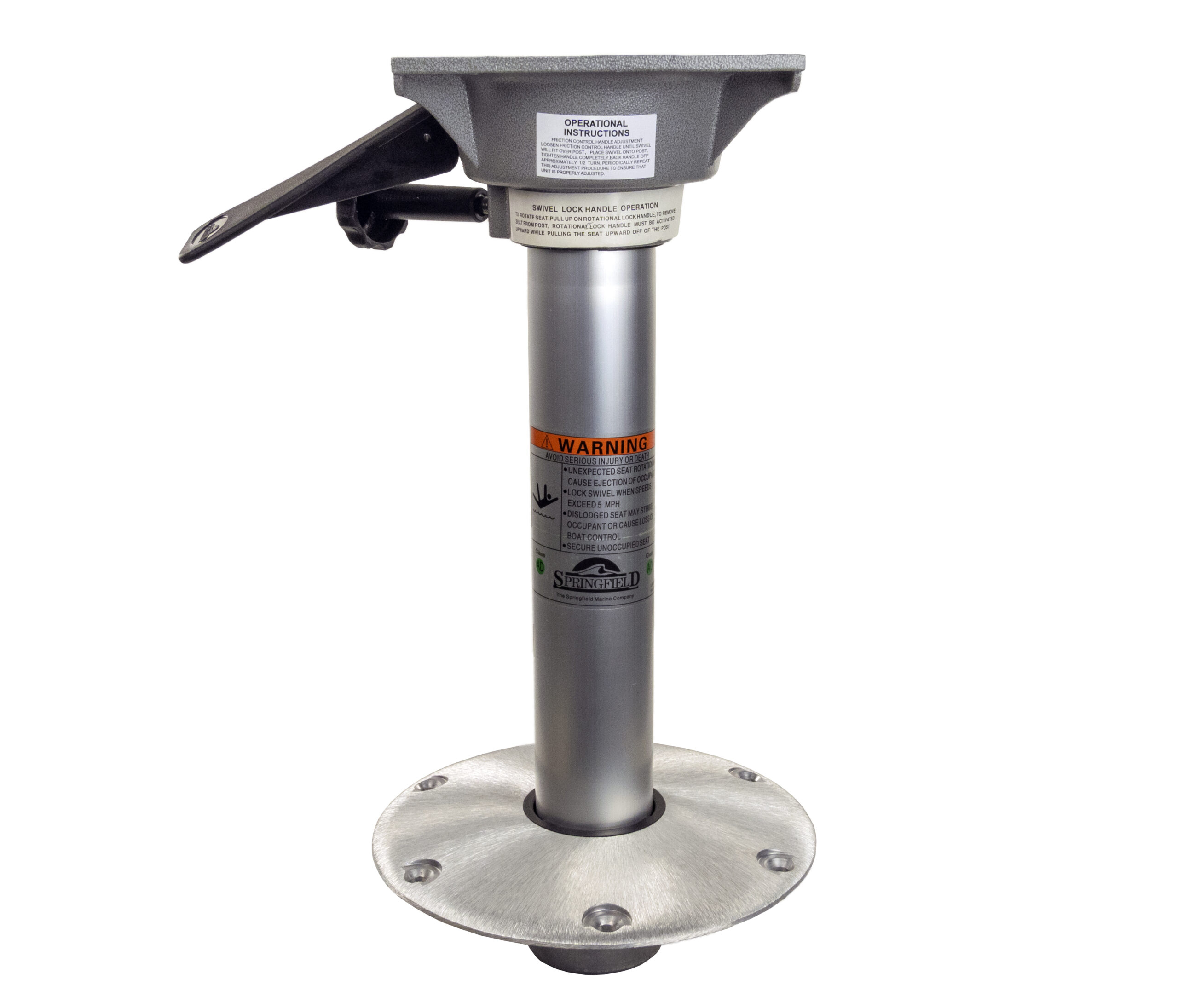 Locking 3-piece package includes locking Trac-Lock™ swivel seat mount, Plug-In™ Hi-Lo fixed height post with anodized finish, and Plug-In™ 9″ diameter base with satin finish.