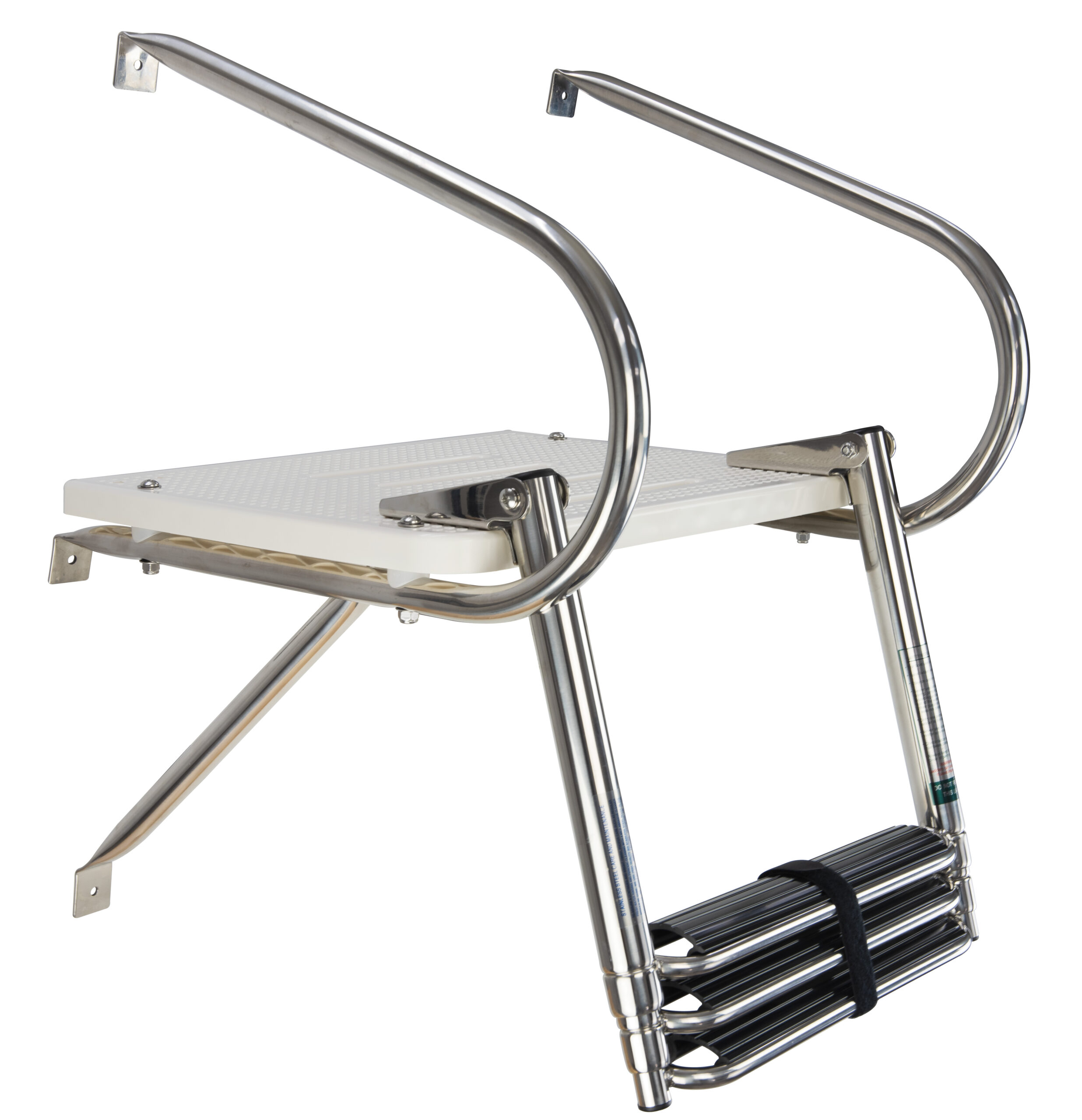 Stainless steel with durable HDPE platform, comfort-step contour-traction black molded poly steps, and safe-assist grab rail. Easy deploy folds out and over with smooth telescope movement. Compact stowage folds over flat to platform. Nylon bushings. 10° transom mount angle. Secure stow strap included. 18″W x 19″D poly platform. Dual 11.5″ handrails.