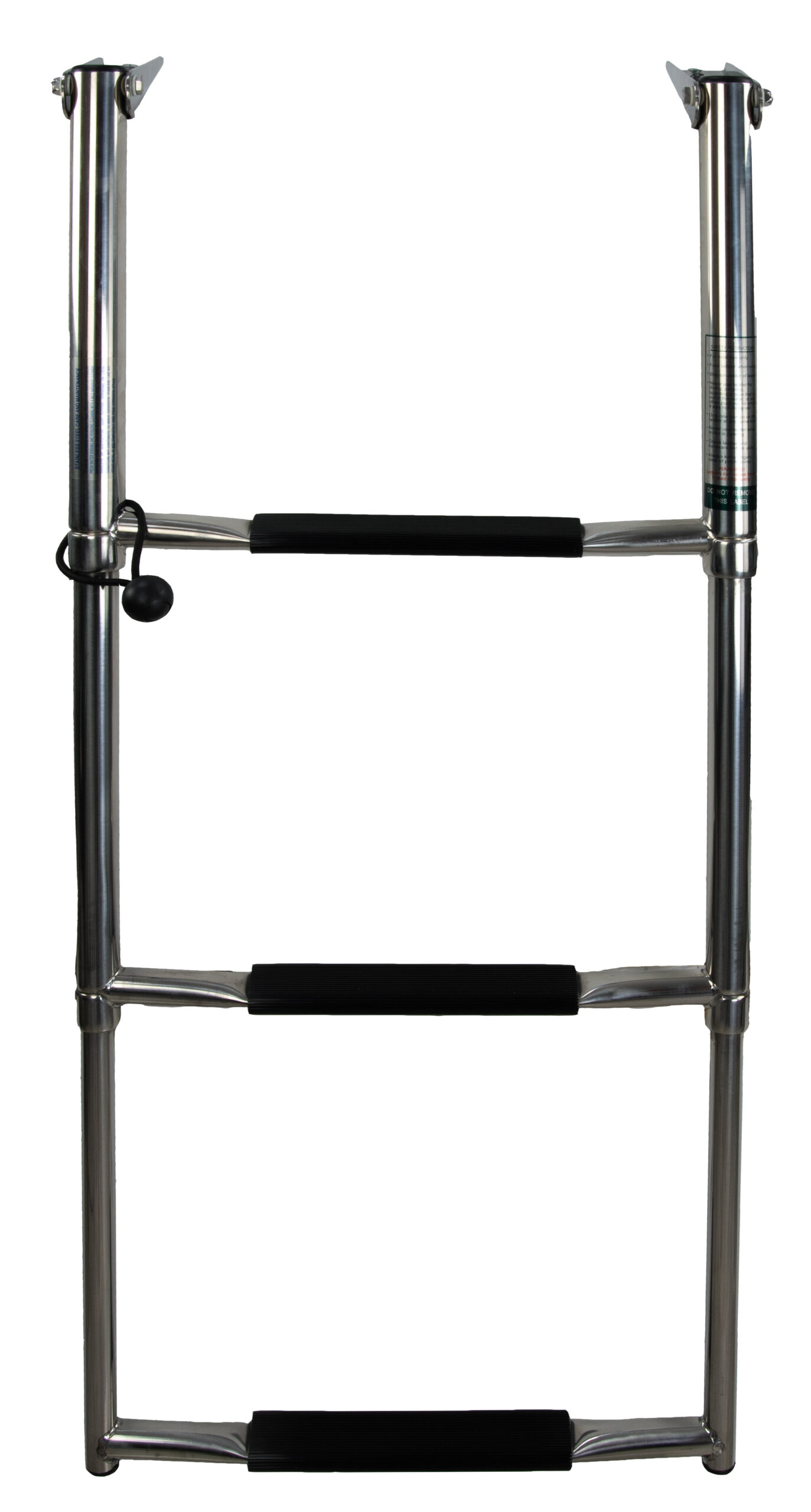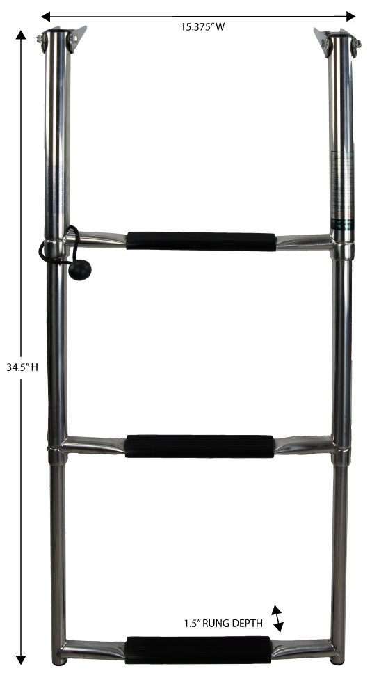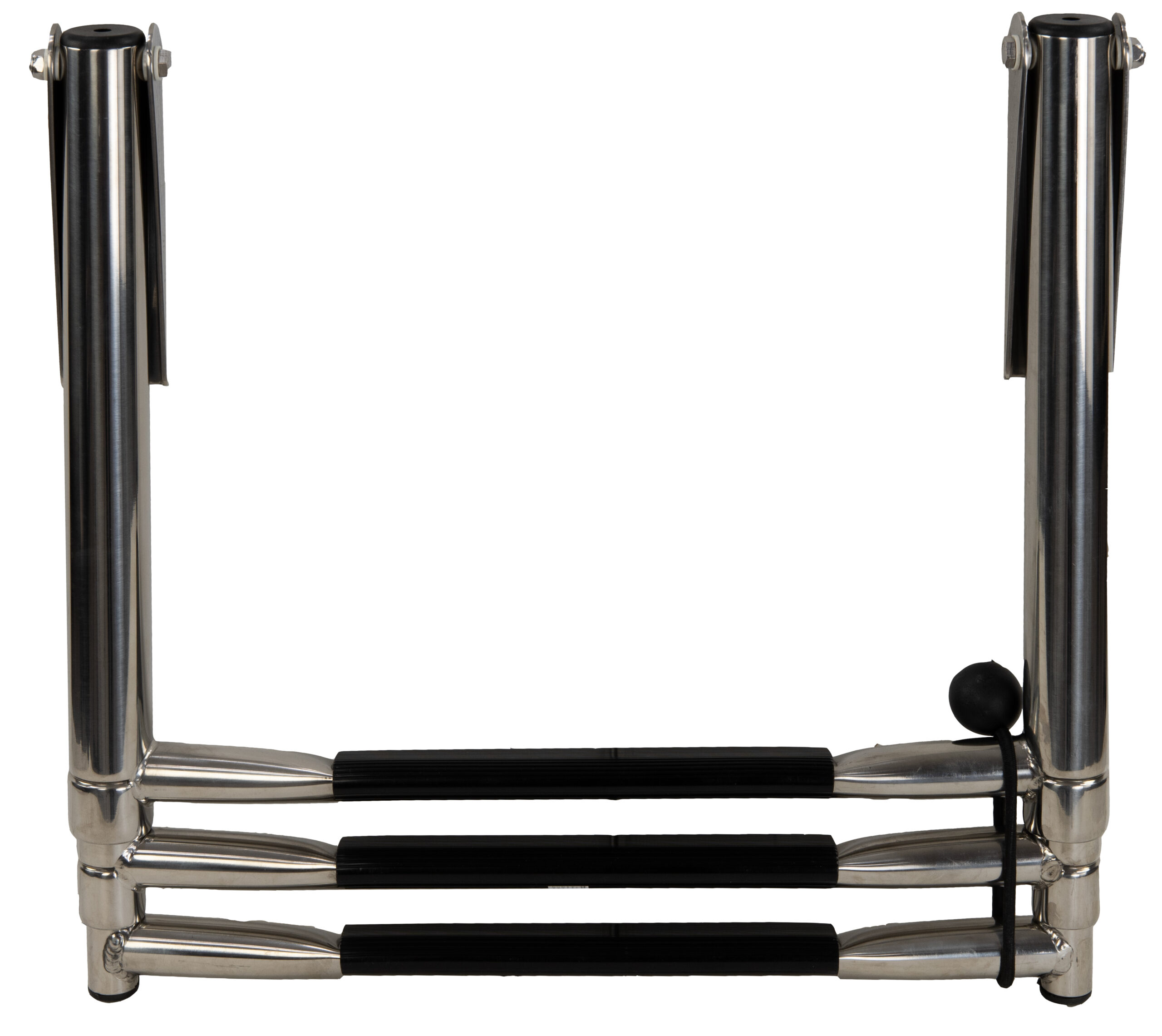 Stainless steel with comfort-step contour-traction black molded poly steps. Easy deploy folds out and over with smooth telescope movement. Compact stowage folds over flat to platform. Includes nylon bushings and secure stow strap is included. Rated to 275lbs.