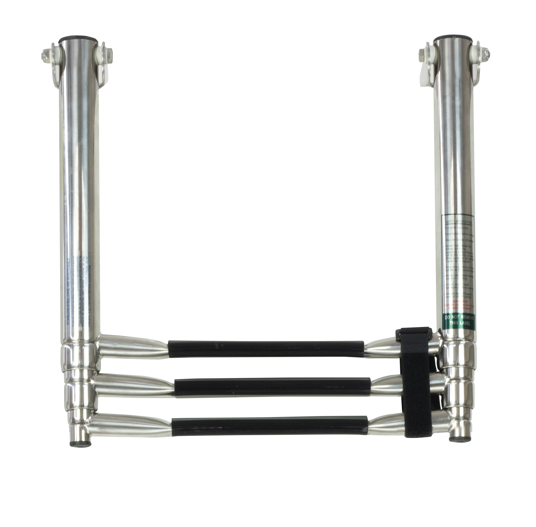 Stainless steel with comfort-step contour-traction black molded poly steps over stainless steel. Easy deploy folds out and over with smooth telescope movement allows effortless boarding for swimmers / divers with inflatables and gear. Compact stowage, telescope up and folds over flat to platform.