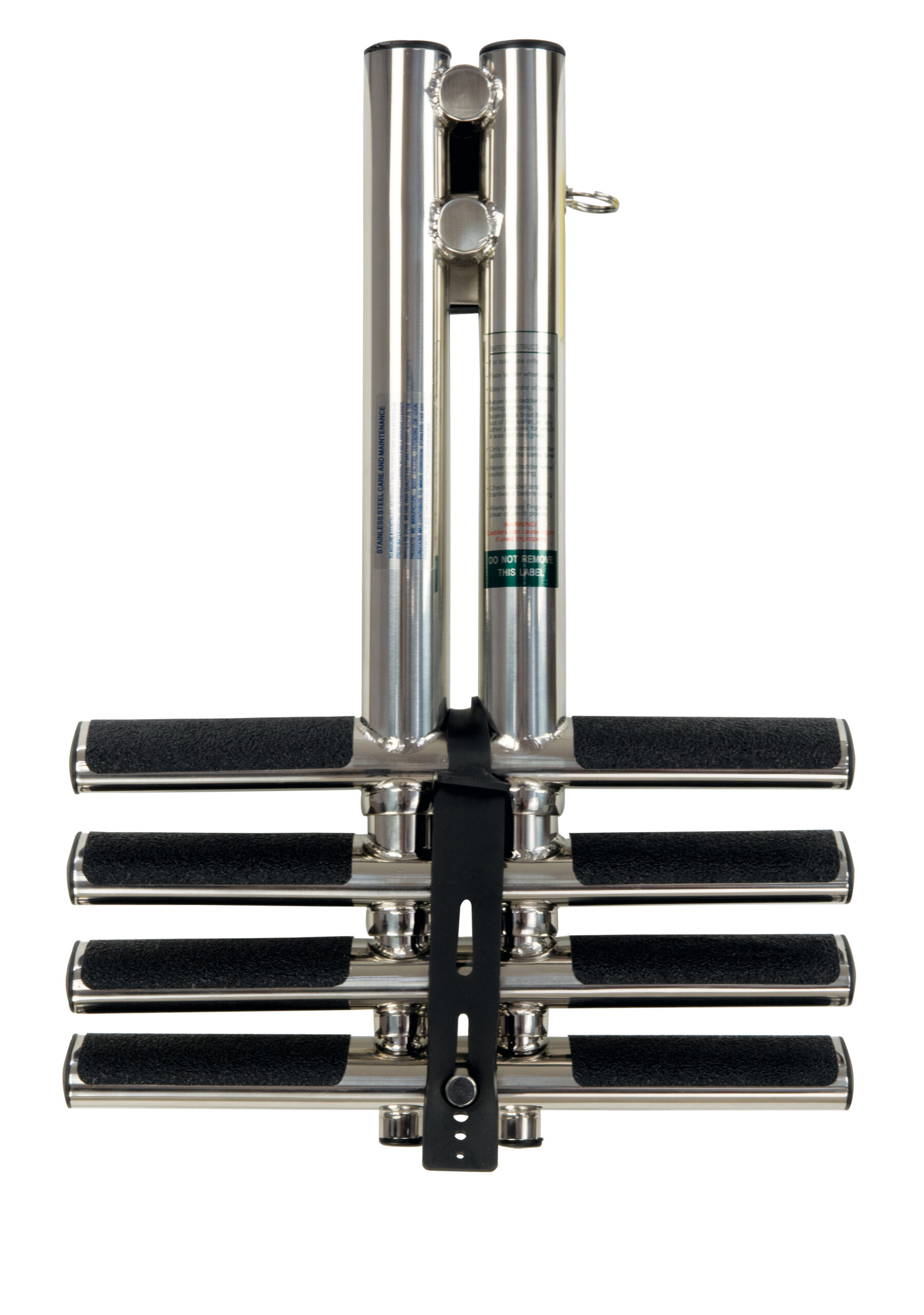 Stainless steel with inside riser and comfort-step contour-traction black molded poly steps. Easy to deploy folds out and over with smooth telescope movement. Compact stowage folds over flat to platform. Nylon bushings. Secure stow strap included. Rated to 400lbs. Stainless steel quick release. Transom mount angled. Great for swimmers or divers.