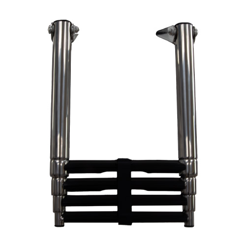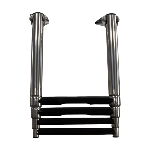 Stainless steel with comfort-step contour-traction black molded poly steps. Easy deploy folds out and over with smooth telescope movement. Compact stowage folds over flat to platform. Nylon bushings. Secure stow strap included. Rated to 275lbs. NEW! Patent Pending open step design with proprietary welds for rust resistance and stability. Electro-polished interior and extrerior. Black PVD finish.
