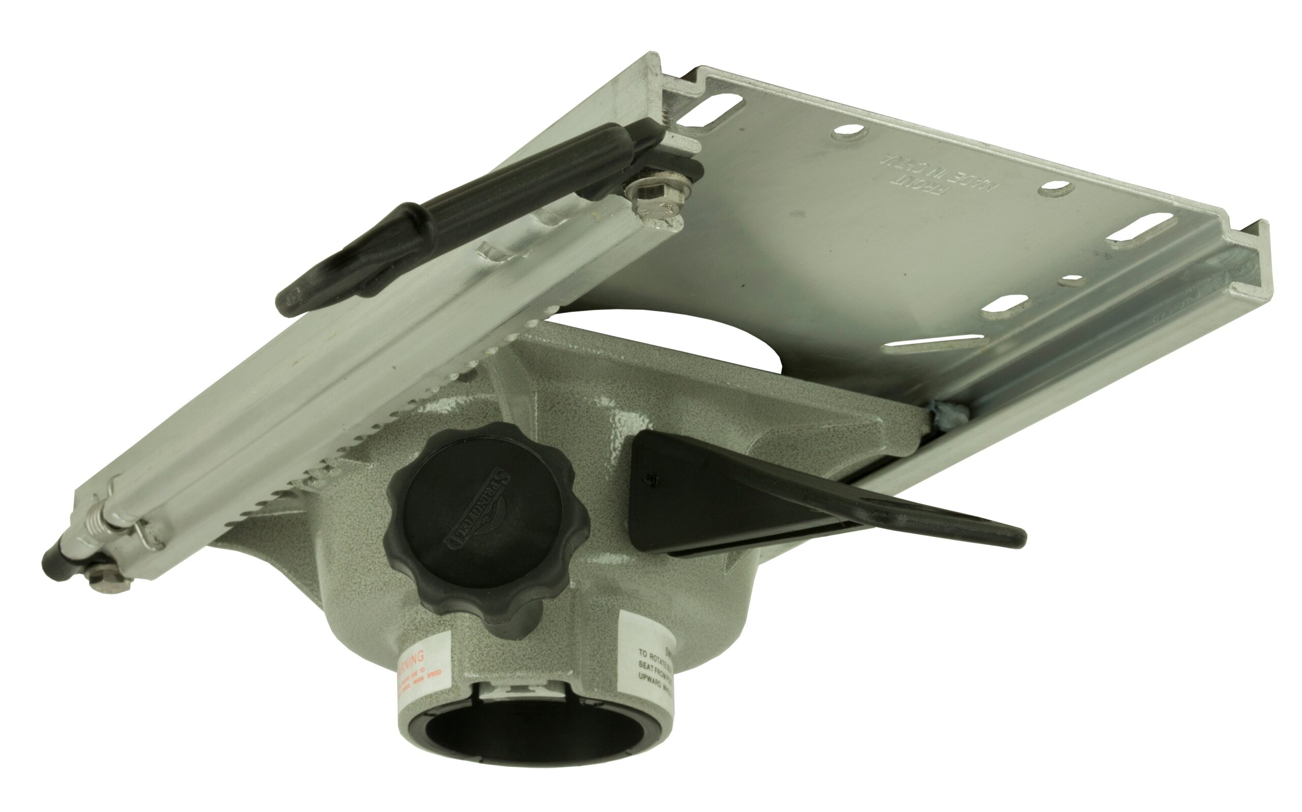 Large 7-1/4″ x 13″ high-strength anodized aluminum platform travels 5-1/4″ fore and aft on self-lubricating pads. Rotates 360°. Centrally located locking handle that is easily reachable with left or right hand. Adds 1-1/4″ of height to pedestal.