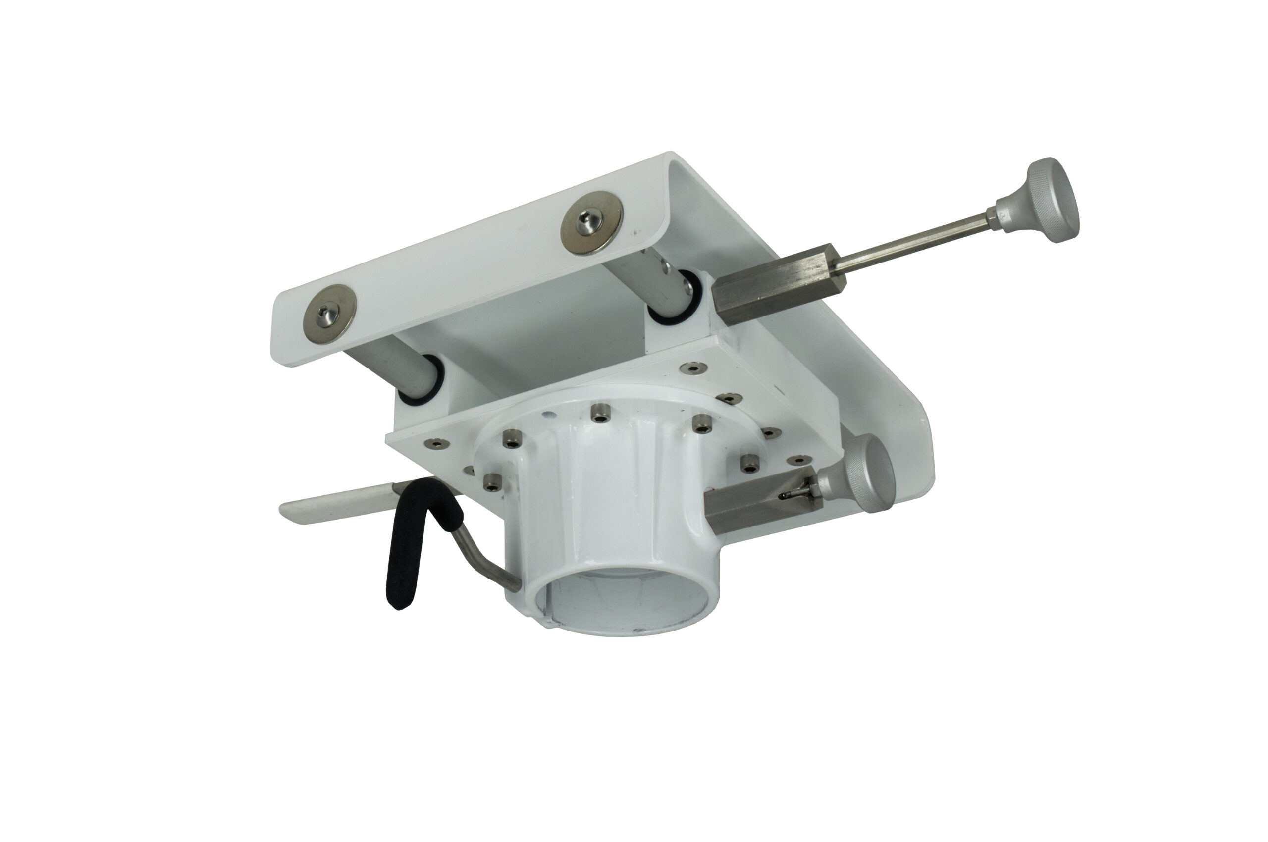 10-1/2″ x 14-1/2″ x 1/4″ aluminum formed slide plate with anodized aluminum finish and heavy-duty stainless steel lock pin. Large easy-to-reach control knobs. Swivels on post. Slide travels 6″ fore and aft. Flip handle for locking pin