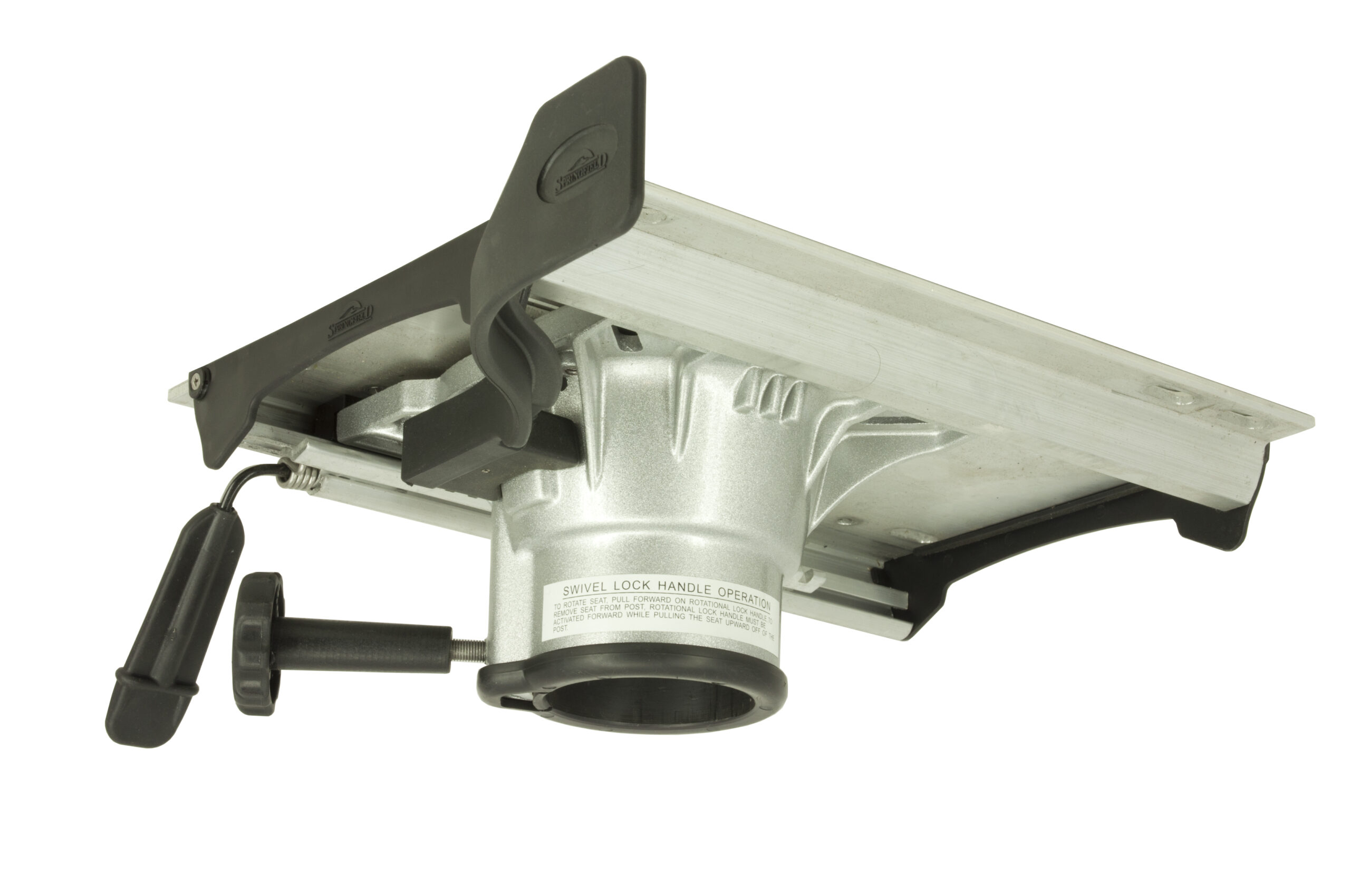 2-7/8″ locking Prestige slide & swivel built with a heavy-duty aluminum cast swivel, deep throat and extended bushing for our most secure seat mount. Extra wide 14″ x 13″ seat mount platform travels 6-3/8″ forward and backwards with easy-to-reach extra-large ergonomic fit under seat handles. Adds 1-1/4″ to height of pedestal. Plastic end caps for aesthetic design under seat. Smooth anodized slide plate for function and design.