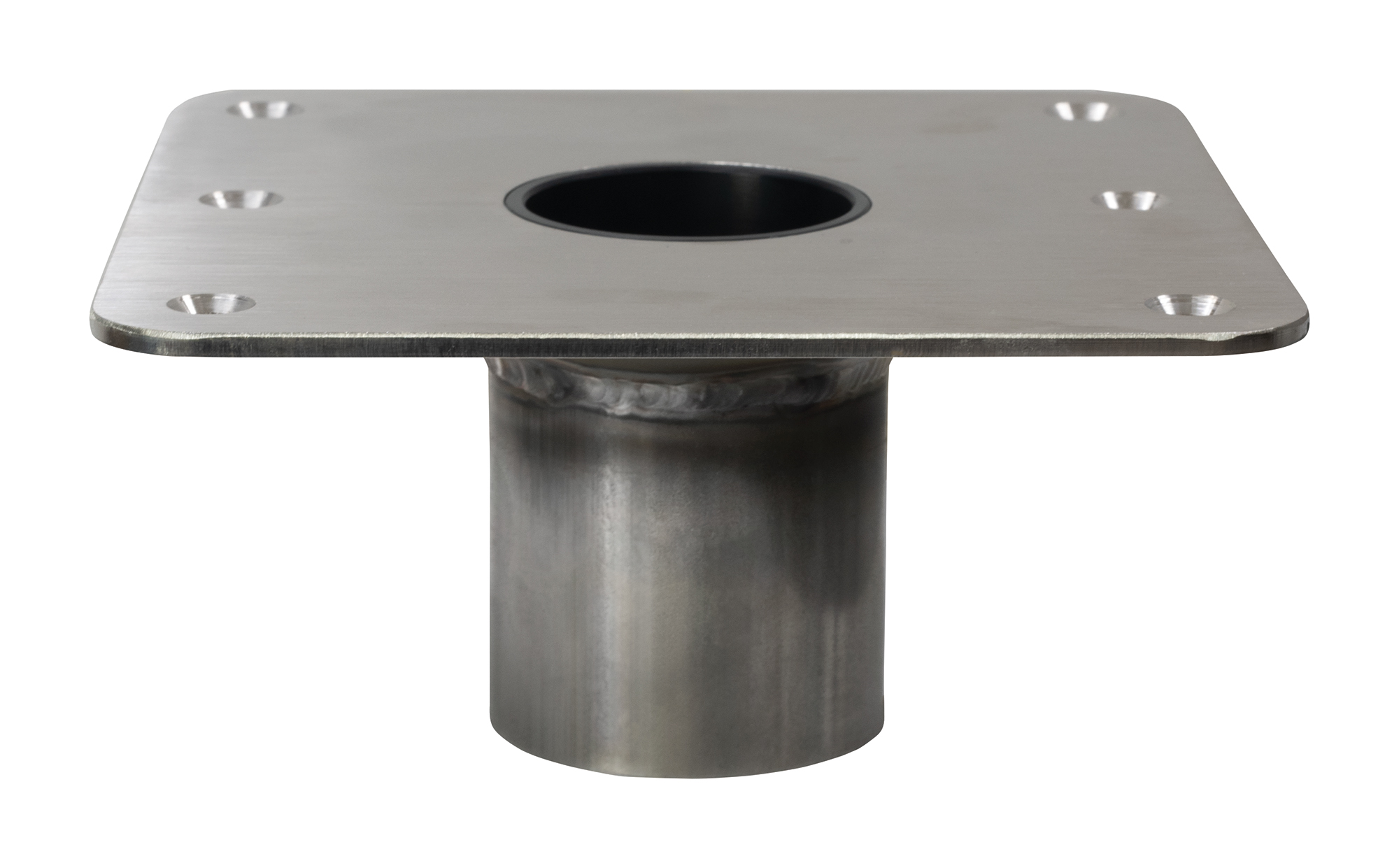 Low-profile stainless steel square deck base with satin finish for 2″ ski tow pylon.