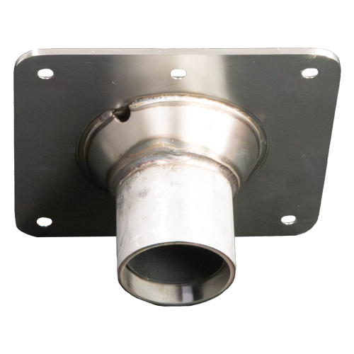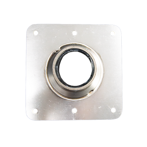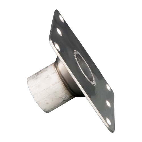 Low-profile stainless steel square deck base with polished finish for 2″ ski tow pylon.